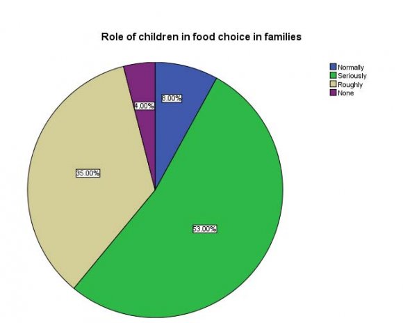 The pie chart represents 53 percent of respondents agree that children seriously play a significant role in their food choice in families. Thirty-five percent believe this proportion is rough. And parents support children play their role normally and sometimes inactive at 8 percent and 4 percent, respectively.