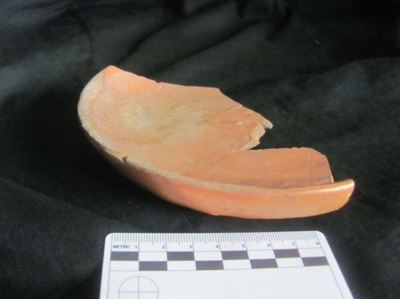 The terrace platform is situated upon a high hill that appears to have been artificially leveled (below the peaks of the Cerro Santo) along the path of the solstice alignment midway between two mountain fissures (Figure 8). From this mountain, water flows into various stream channels leading into the Quebrada San Agustín, which flows around the hill and platform deep forming ravines on the west side that today requires a pedestrian suspension bridge. The hill platform is clearly terraced on the west side where huge megalithic stones aligned 238° show four extant tiers or stairs of dry-stone masonry. With many stones fallen or scavenged for recent construction, this architectural feature was probably originally longer and higher than what is seen today (Figure 9a). Encountered were diagnostic ceramics of the Late Muisca and Early Colonial periods, including a cached Fine Orange ring-based vessel (Figures 9b-c). There also appears to be more terracing on the east side along a possible access ramp or stairway leading down to water giving the entire structure a pyramidal shape, but only intensive survey and architectural excavation can determine this for sure.