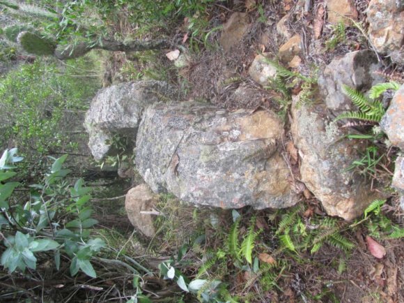 Our contribution to site of El Infiernito is the newly discovered archaeological evidence for intensive agriculture and water management (Smyth et al. in press). Reconnaissance identified hydraulic works and evidence for major erosion events potentially related to rapid climate change, i.e., significant droughts and/or major flooding episodes. The Loma Carrera (Figure 3a), an upland area, contains a natural perennial spring (Cañada las Peñas) situated above a carboniferous shale deposit that produces hydrostatic surface water that empties into the Rio Leyva. Near the spring are two possible anthropogenic ovoid pools reminiscent of the ceremonial baths or "lavapatas" at the Alta Magdalena site of San Agustín in southern Huila (Duque Gomez 1964; Drennan 1995). Seasonal drainage was captured by a catchment surface and stone conduit that connect to a double alignment of upright megalithic boulders above a cross-channel boulder wall (Figure 3b). These hydraulic features are seemingly part of a reservoir and check dam system designed to collect and divert runoff water for irrigation agriculture.