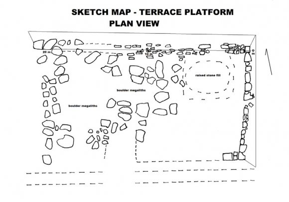 The platform itself is supported by a 11-m stone retaining wall of cut stone masonry oriented 14° east of north with block cornerstones up to 100 cm tall (Figures 10-a-b). The west wall exhibits stonework that could have supported a possible palisade and a raised stone surface on-platform near the northeast corner suggests a circular superstructure (uta) likely some form of Muisca perishable walled and roofed building (temple?). The west wall extends more than 20-m before integration into a zone of shaped megalithics some over 2 m long but fallen from their original upright positions. Many stones form a boulder alignment apparently as a division or western platform boundary (Figures 11a-b). In this area a Herrera phase potsherd was recovered and along the platform west wall were ceramics of all Muisca time periods (Figures 11a-c). These ceramic data indicate ceremonial activity spanning the entire indigenous occupation sequence and suggest that religious rituals were performed here until the founding of Villa de Leyva.
