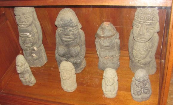 The Leyva statues are far superior in workmanship to the Mongua statues, which should not come at any great surprise because the Muisca of the Leiva Valley were famed stoneworkers actually responsible for building many of the early Colonial buildings at Villa de Leyva. Like the Mongua temple, the Leyva terrrace platform and statues must also relate to themes of water and fertility closely tied to worship of the sun as well as the origin myth of the Muisca. The alignment of the solar observatory at El Infiernito with a mountain water temple on the winter solstice surely emphasizes the great practical and cosmological significance of water for agricultural production. Human fertility is symbolized by female statues with large breasts (Bachué) while the portrayal of adults and children together clearly recalls the Legend of Iguaque.