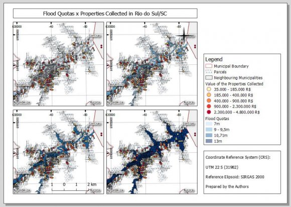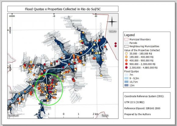 Picture 06: Unitary flood quotas, overlapped with the properties collected Applying SAGA's software tools, it was crafted interpolation between properties values and its m² values, from the ordinary kriging method, focusing on data distribution analysis. The results are available in Picture 07.