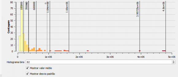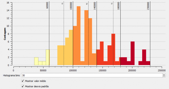 In the analysis, properties over 2,500 m² (26 cases) and prices over R$ 350.000 were discarded, which could show distortions in the results, setting the already mentioned outliers. Therefore, 152 properties served for the total value kriging process. The resulting values histograms can be seen, in sequence, in the Pictures 08 and 09. With the kriging done, QGIS and its plugins served as tools to the process of extrapolating the pixel values (in m²) for the lots (parcels) polygons. We adopted the square meter (m²) as variable to this research step based upon that the total values can present some distortions since the price of a property is composed of various characteristics. That heterogeneity is an inherent factor to the real estate market analysis. In this sense, the estimated m² value based on the samples showed itself as the suited alternative for the analysis.
