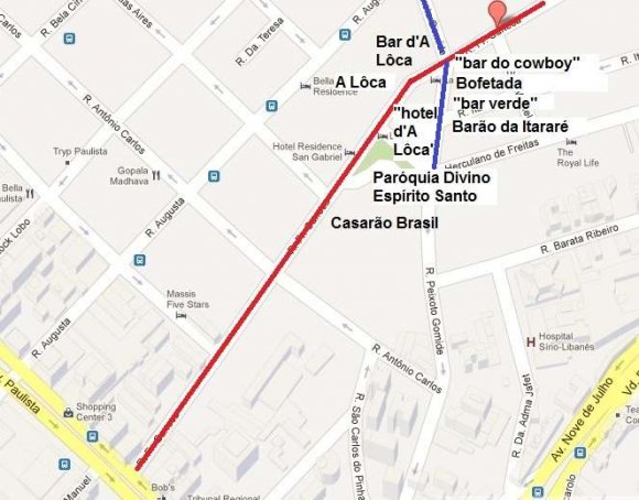 Map 4 -FreiCaneca Street highlighted in red, PeixotoGomide street highlighted in blue, portraying some of the spots addressed in this article.