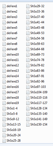 We collected 193 electronic raw texts representing all the (154) known sonnets of Shakespeare, taken from The Project Gutenberg EBook of Shakespeare's Sonnets, by William Shakespeare, and some (38) surviving poems available in the public domain that are widely agreed to be written by Edward de Vere, taken from Literature online http://literature.proquest.com/searchFulltext.do?id=Z20 0338111&childSectionId=Z200338111&divLevel=2&qu eryId=2911490928155&trailId=15256B22E85&area=po etry&forward=textsFT&queryType=findWork). We converted the texts into ASCII.txt.doc format, and removed anything that isn't body text (e.g. headings, numbers, section headings, titles, etc). Some texts were really short, containing less than 20 lines. Such texts were impossible to cluster. Thus, we decided to adjust test text sizes and make them of comparable length. For each author, we aggregated every 3 or 4 works into one independent text file which should be analyzed. We had 49 text files as a test set, 30 text files for Shakespeare named ShSo1-4 to ShSo49-154, and 19 text files for de Vere, named deVere1 to deVere19. These texts are shown in Table /1 Finally, we tokenized (segmented) each input text.doc into a bag of words and then removed content words. Content words are the words which appear less frequently in text files but provide less information in identifying the important style features of each text file. After this preprocessing, each text file is represented by a variable vector of style features. These style features are variables that attempt to represent the data used for this authorship test. We generated a lexical frequency data matrix (D1) with 5081 lexical types, a lexical frequency data matrix(D2) with 4893 lexical types, and a lexical frequency data matrix(D3) with 4889 lexical types. We reduced the dimensionality of (D1, D2, and D3) to 100, 80, 80 respectively. In each of these data matrices, each text file is represented by text lexical type score. Then all text lexical type scores are ranked in descending order according to their scores. A set of the highest FW/W.bi-gram/Char.bi-tri-gram score text files are selected as text FW/W.bi-gram/Char.bi-tri-gram summary based on Variance Term Frequency. Inverse Document Frequency (VTF.IDF), in which: