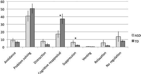 The next step is selecting a regulatory strategy. This is done from the repertoire of strategies available to the individual. As prior studies have shown, although children with autism use fewer emotion regulation strategies in general, they use more expressive suppression and less cognitive reappraisal than their typically developing counterparts (Samson et al., 2012, Jahromi et al., 2013). This finding persisted even after controlling for differences in emotional experiences and alexithymia (Samson et al., 2012). The same study showed that the efficacy of these strategies was equivalent in children and adolescents with autism and TD kids. Two charts from Samson's 2012 study below show the differences between autistic and typically developing adolescents and children in their emotion regulation techniques.