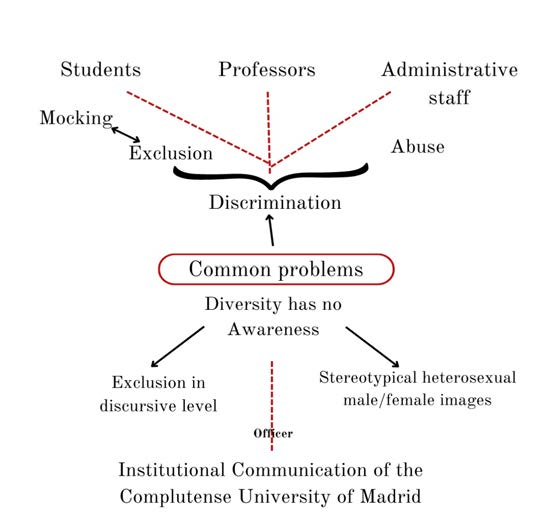 Although the Complutense University of Madrid can consider itself to be a respectful and violent-free atmosphere for the LGBTQI+ community, the results obtained affirm that the institution needs to reformulate its communication strategy if it wants to position itself as In this regard, students defend that there is a need for greater tolerance towards differences with the teachers, as well as an increase of the visibility of the units inside the university that are dedicated to offer specific services to the groups in need.