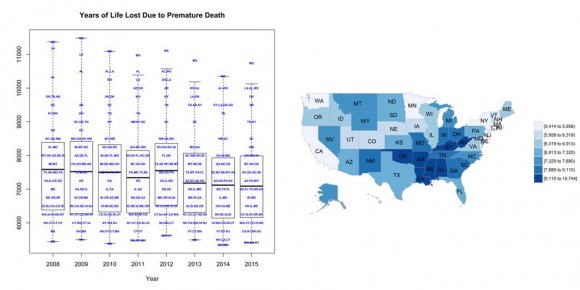 In this study, we compare the efficiency of health care resources on a state-by-state population basis in the US between the years of 2008-2015. This includes examining the 50 states through the application of a non-parametric method known as Data Envelope Analysis (DEA). DEA allows multi-input and multi-output analysis. DEA measures productivity efficiencies of Decision Making Units (DMUs). In our paper, DMUs represent the states. DEA creates an efficiency frontier and compares all DMUs against the frontier. In addition, DEA is used to obtain a Malmquist productivity change index, which is a flexible, mathematical programming approach for the assessment of productivity through input and output variables (Roh, 2011).We selected four input variables: insurance coverage of citizens; the number of physicians per 100,000 residents per state, the number of hospital beds per 1000 inhabitants per state, and public health funding per capita per state. We selected one output variable: years of life lost (YLL) to reflect the population burden (Burnet, 2005). Years of life lost are a population-based mortality indicator of the impact of a disease on society (CDC, 1993; Murray, 1996;Murray 2002).The years of life lost metric was developed by the Global Burden of Disease Study (Murray, 1996) to identify the burden of disease and premature death. Burden of disease studies have been implemented using indicators such as the years of lost life (Fontaine, 2003;Burnet, 2005;Kenney, 2008;Putzer, 2015).We conducted analyses to evaluate the differences over 2008-2015 to compare each state vis-àvis the other states to examine the efficiency of the use of health resources on disease burdens.