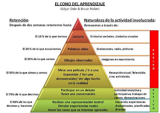 Figura 1: Cono del aprendizaje (10) Por tanto, los esquemas o formatos de evaluación que elabore el docente en forma planificada y previa, deben ser consistentes con los conocimientos, habilidades y destrezas que se desean medir y evaluar como algo positivo, armonioso, necesario, importante y de gran crecimiento individual y colectivo. Es necesario que los docentes centren su atención en los procesos de evaluación para dar garantía de calidad en el ciclo enseñanza -aprendizaje, generando coherencia y congruencia entre lo enseñado, las estrategias metodológicas utilizadas y el tipo de evaluación para medir lo que se desea medir: saber, saber hacer, quehacer, actitud, desempeño, entre otras. Además para que la evaluación termine midiendo lo que se pretende, la evaluación debe ser tanto o9 más planificada que las mismas clases, talleres, laboratorios y, debe generar nuevo conocimiento en el área de la docencia pues es la fase menos explorada y documentada en la gestión educativa (10,17).