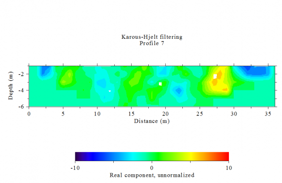 The ABEM WADI VLF-EM Instrument used to measure the EM response is a portable instrument which measures the electrical properties of the subsurface, using EM induction as detailed in McNeil (1980a). In this work, thirteen EM profiles were made using a 20m coil spacing, with an expected maximum depth of investigation of about 15m for the horizontal dipole (HD) mode (McNeil, 1983). The EM data were collected at 20m interval along thirteen profiles (Fig. 3) with lengths ranging from 300 to 1700m. The VLF-EM data were presented as profiles figures by plotting raw real (quadrature) measured on the field and the filtered real while their corresponding Karous-Hiljet (K-H) pseudo sections are shown in Figures respectively. The The VLF WADI instrument displays the filtered real anomaly on the screen, and this anomaly can be roughly interpreted on site. This feature of the instrument is used to select sounding locations for resistivity surveys. For further detailed information of the subsurface, the measured real anomalies were rediscretized at 1 m interval and filtered using the approach of Karous and Hjelt (1983). This process yields pseudo-section of relative current density variation with depth. A higher value of relative current density corresponds to conductive subsurface structures.