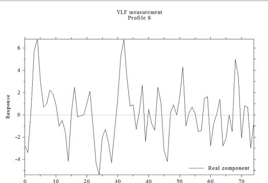 At location VLF 06 with traverse oriented in the E-W direction, a well-fractured zone with positive Fraser filter was identified (Fig 9a). It is located at a horizontal distance between 11-13m, along the profile at depth of between 2-6m. Similar was the case at location VLF 07 with a prominent fracture zone located at a horizontal distance between 28-34m (Fig 10a), along the profile at depth between 2-6m. At VLF 08 with traverse oriented in the N-S direction, two probable and another two not wellfractured zones were identified. They were located between 5-8m, 32-34m, 50-52m and 68-70m respectively along the profile (Fig 11a). The depth of each fracture zone was between 0-40m, 0-35m, 0-30m and 0-30m respectively all with orientation sat NE-SW (Fig 11b).