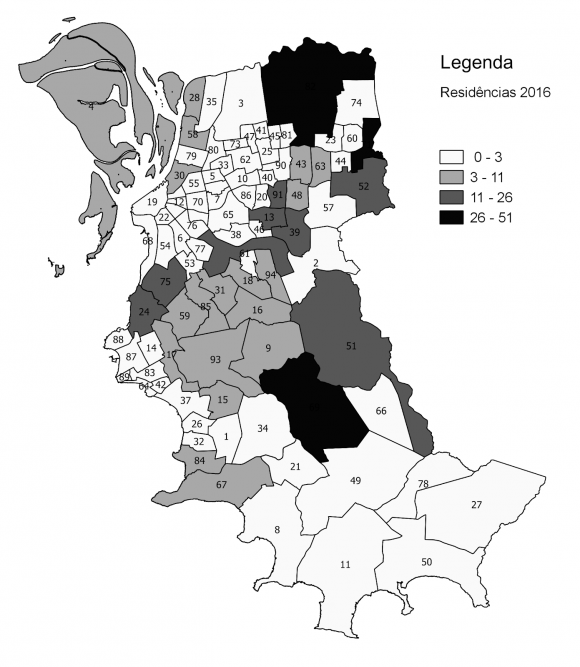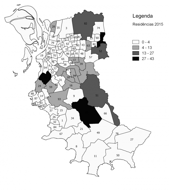 The software allowed the production of a series of maps demonstrating which neighborhoods had the highest and lowest concentrations of residences (living places) of young people murdered, as well as the neighborhoods where there was possible to observe the highest and the lowest incidence of homicides (places of death) in the period studied. It is noteworthy that the indexes used refer only to the distribution of absolute numbers of young homicide victims (both in relation to their place of residence and place of death), so that the rates produced that take into account proportion of young people in each territory.