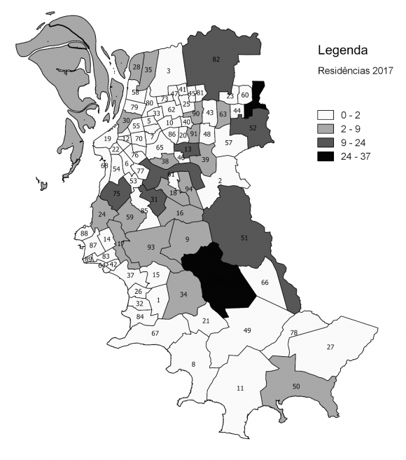 Another noteworthy circumstance is the "shift" in the spatial dynamics of residential and homicide distribution. This has been the case in 2018, observed, for example, in the residence concentration decrease verified in "Mario Quintana" and "Santa Tereza" neighborhoods, to the detriment of the growth observed in "Bom Jesus" and "Partenon" neighborhoods. The "Vila Nova" neighborhood also appears in 2018 as a place with higher incidence of homicides, amounting to the same frequency and same percentage verified in "Santa Tereza" neighborhood. Further studies should be conducted in the coming years to see if these trends can be verified.