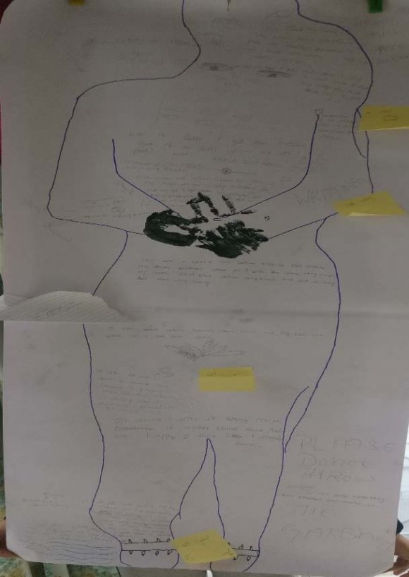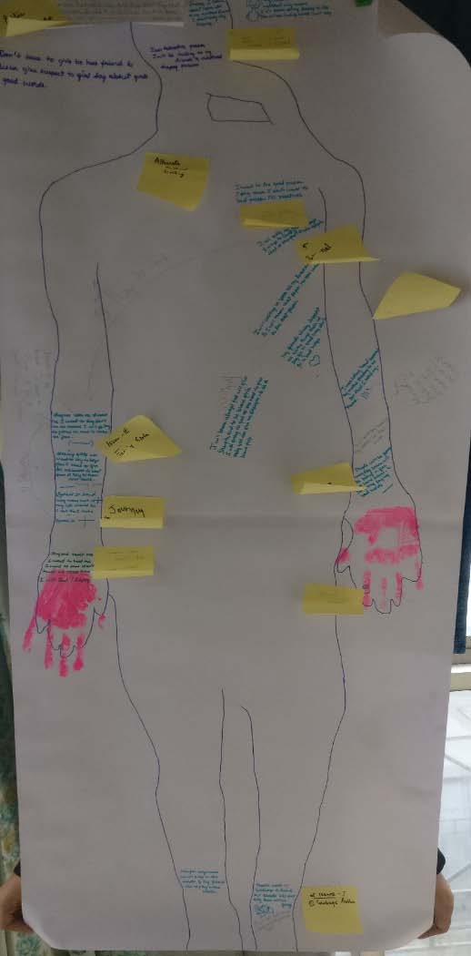 Participant shows increase likelihood to be around friends and seek reassurance. Intimate peer relations and peer acceptance to be of increased concern to adolescents (Crockett et al., 1984; Furman & Buhrmester, 1992; Veronneau & Dishion, 2010). She often cries in isolation when hurt and expects peers to show concern. Participant also writes about her thoughts and feelings. There is a need of belonging and a space to vent. At the end of the interview she also stated, "what in my heart I said you all and my heart is free". Body maps allow communication of emotions especially as a child centric tool (Gamlin, 2011).