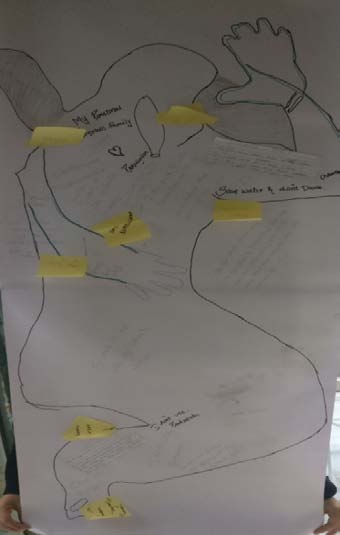 Body mapping is a multipurpose qualitative instrument adapted by Solomon (2002) as a narrative process to understand the story of HIV women living in Cape Town, South Africa. It is considered to be an artbased therapeutic tool. Participants communicate their overall story via creation of different symbols and meanings attached to their experience (Gastaldo, Magalhaes, Carrasco & Davy, 2012). A body map is a life -size representation of one's self using different symbolic slogans in order to put across one's experiential story. Davy et al. (2014) states body mapping allows data collection in a creative manner without causing any harmful conditions in a confrontable approach (Davy, Magalhaes, Mandich, Galhiego, 2014). Based on research design, this semi-structured interview used three key elements, a testimonial (first person narrative experience); a life size body map; and defining characteristics of visual representations. Researcher established an interview guide based on the three objectives of the study. Each participant took part in three individual sessions of one hour each. Homework was also assigned to participants. This research used body manual procedure and guide adapted by Gastaldo, Magalhaes, Carrasco & Davy (2012) which provides more flexibility; detailed manual and ease access to guide. It permits use of manual for research purposes.