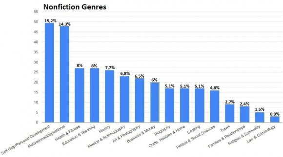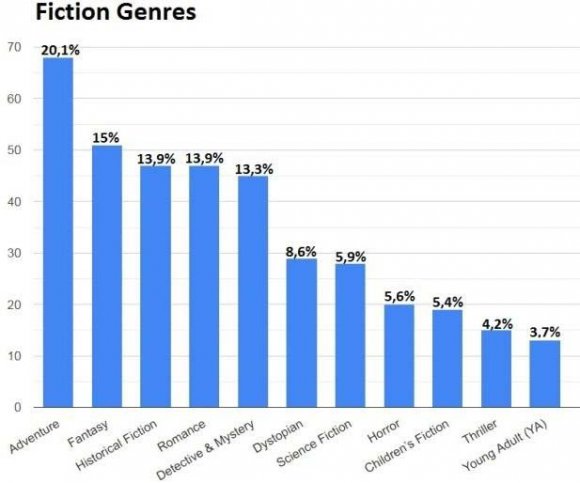 13-20 years old 40-60 years old people more often than those from other groups bought borrowed books from a library. School and college students more often than others downloaded books for free, and also borrowed them from a school library. popularity of various genres differs significantly among different groups of respondents. In particular, the popularity of different genres among young and old respondents is quite different. The picture of fiction genre popularity looks this way (Figure 11): Adventure (20,1%), Fantasy (15%), Historical Fiction and Romance (13,9%), Detective & Mystery (13,3%), Dystopian (8,6%), Science Fiction (5,9%), Horror (5,6%), Children's Fiction (5,4%), Thriller (4,2%), Young Adult (3,7%). When answering the open-ended questions «Which life-changing books that shaped your thinking?» and «Which book you've recently read?» 6 times respondents named John Green, 4 times respondents named George Orwell, 3 times respondents named