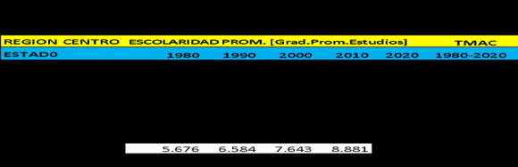 iii. Escolaridad Promedio: Panorama Región Centro El promedio escolar en un país o región resulta un indicador importante para medir la capacidad del sistema económico, pero particularmente la responsabilidad de parte del Estado, de proporcionar educación de buena calidad a la población, así como un mecanismo para fomentar la capacitación de su fuerza laboral y aumentar su valor agregado para poder insertarse productivamente al aparato productivo regional o nacional. Para este fin reproducimos en el cuadro siguiente la información disponible sobre el grado de escolaridad promedio (primaria, secundaria, medio superior y superior) para cada una de las entidades que integran la región Centro para el periodo 1980-2020e.