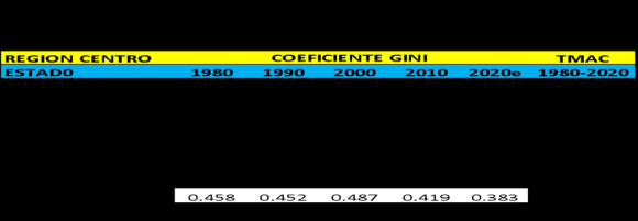 Para fines prácticos de nuestra discusión, mientras su valor resulta más cercano se encuentra de cero (0.000), la distribución de la riqueza al interior de la nación o región, ésta tenderá a ser más equitativa o menos desigual. Por el contrario, mientras más próximo esté de la unidad (.999), existirá más desigualdad en la economía. Bajo esta premisa, presentamos en el Cuadro 2.4 los valores del coeficiente de Gini para cada una de las entidades integrantes de la región Centro para el periodo 1980-2020e.