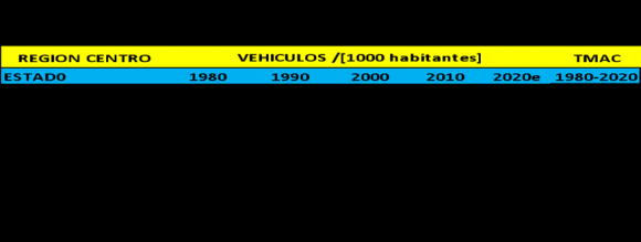 Un indicador clave asociado al nivel de industrialización, pero igualmente al hacinamiento humano, reflejo claro de mejores niveles de vida de la población en la región, es el grado de motorización vehicular en ésta, en términos del número de vehículos automotores por cada mil habitantes. Con esta idea presentamos el Cuadro 3.3 que exhibe esta información para cada una de las entidades de la Región Centro para 1980-2020e.