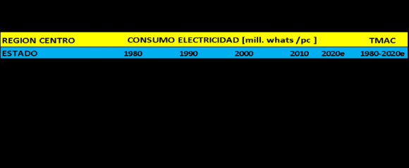 Un indicador clave correlacionado con el nivel de industrialización, pero también a mejores niveles de vida de la población (mayor de consumo de electrodomésticos y otros bienes que utilizan energía eléctrica) en una región o país, es el consumo de energía eléctrica (Watts, pc.) en la misma. Con este propósito presentamos el Cuadro 3.3 que despliega el consumo eléctrico para cada una de las entidades de la Región Centro para 1980-2020e.