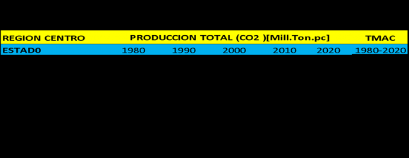 Para estudiar este indicador nos apoyamos en el Cuadro 3.4 que muestra la producción de gases de efecto invernadero, en millones de toneladas de CO2, para cada una de las entidades que integran la región Centro durante el lapso 1980-2020e.