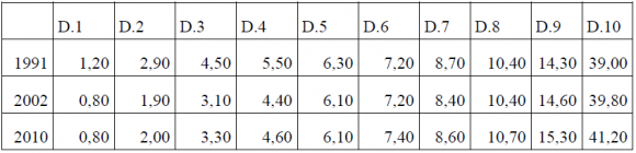 Finalmente cuando se mira por deciles de la población se puede constatar que, el ingreso se concentró en los estratos más ricos de la población. Con información de la CEPAL para el período 1991 y 2011 se tiene que el 10 de la población más rica concentró en 2010 el 41.2% del total de ingresos de la economía, en tanto que el 10% más pobre solo accedió al 0.8% del total de ingresos; estos resultados en comparación con 1991 indican que los más pobres redujeron en 0.4 puntos porcentuales su participación en el ingreso; en tanto que los más ricos aumentaron su participación en 2.2 puntos porcentuales.